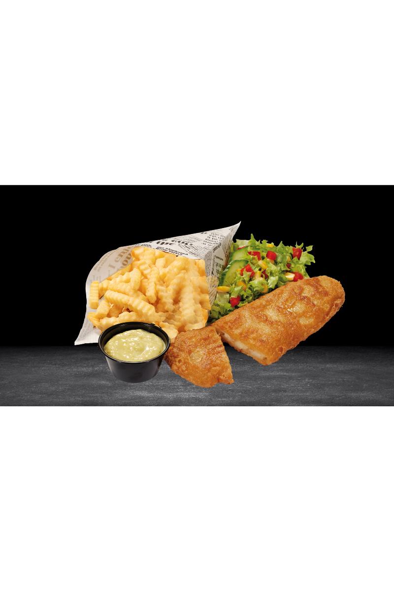 Fish & Chips m/salat, dressing og remulade